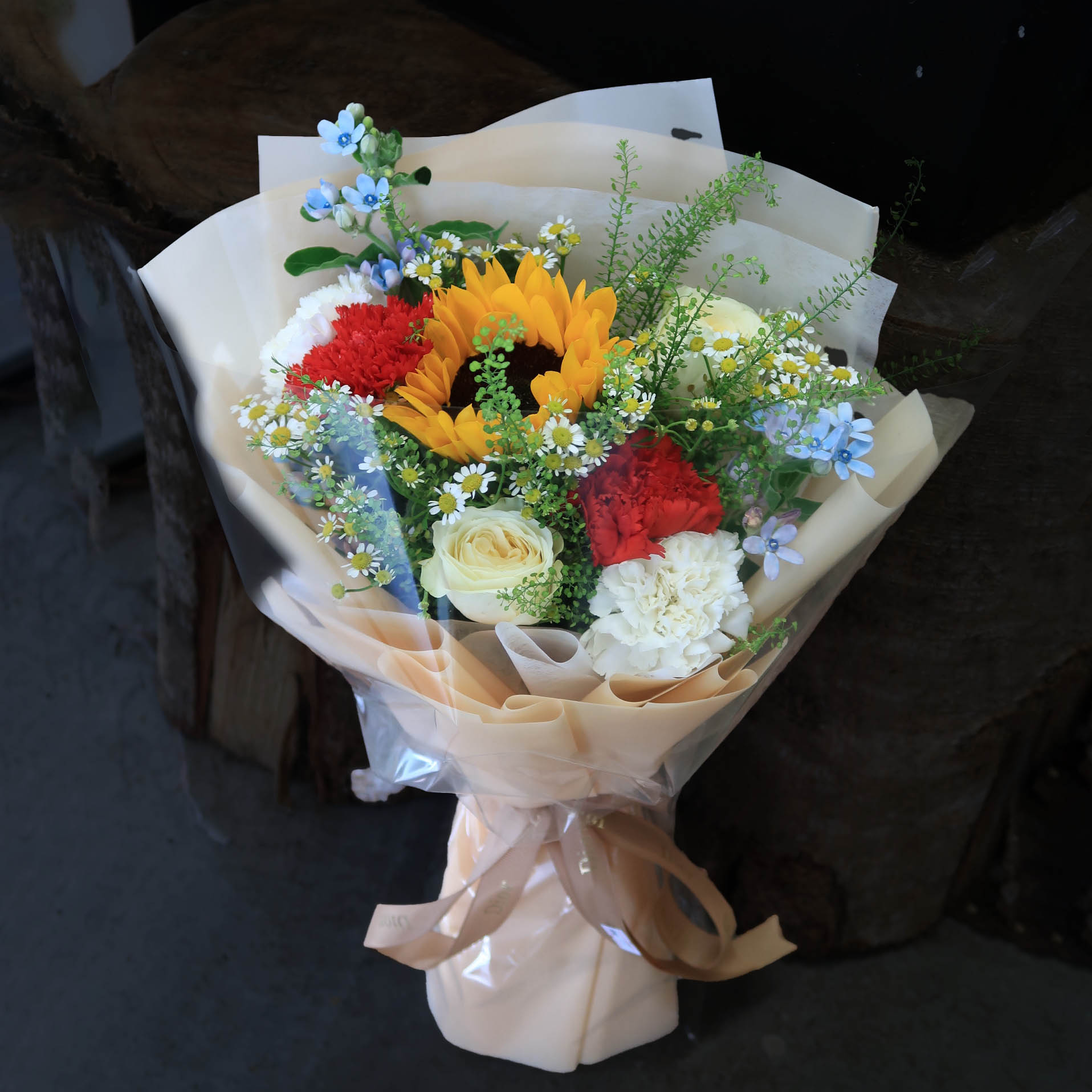 | Arrangement Includes | Sunflower, Roses, Carnation, Oxypetalum, Chamomile and Foliages. |